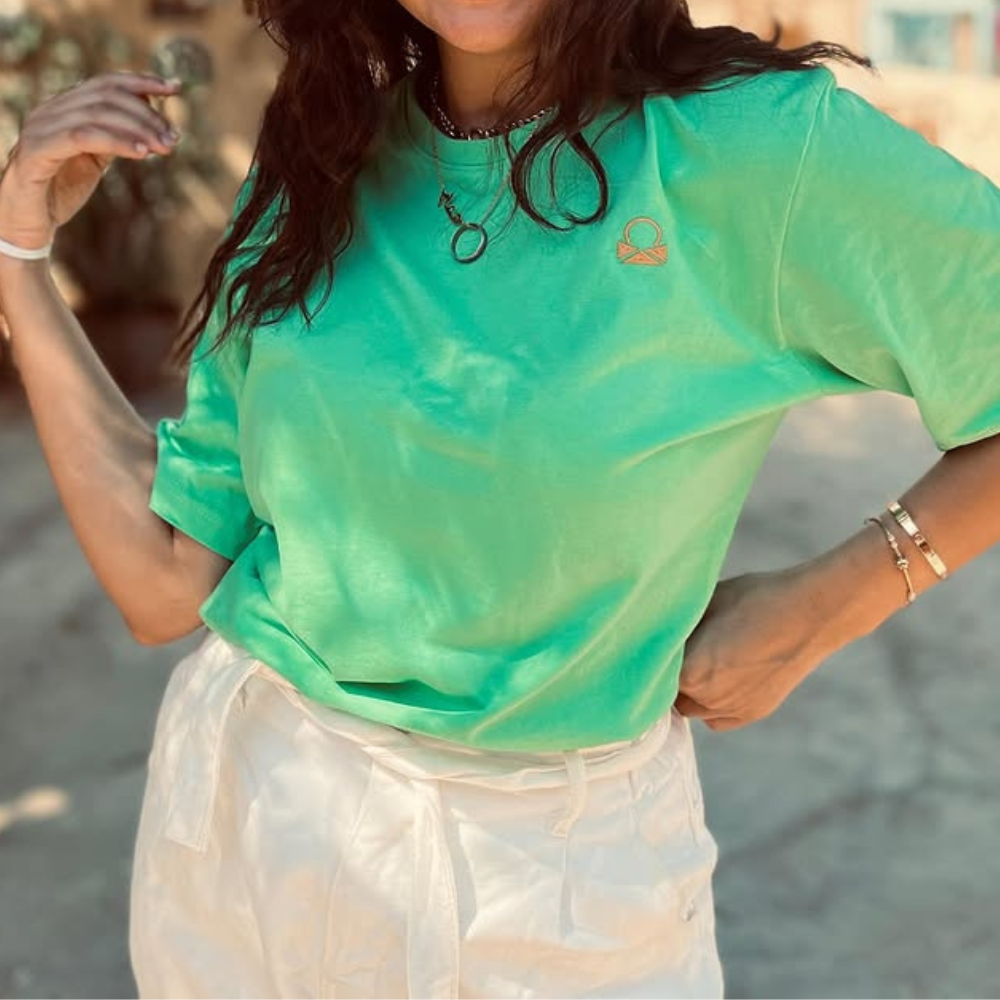 This T-shirt stands out with a bright green color and a small minimalist emblem. The soft fabric feels lightweight and comfortable. Its loose fit offers a relaxed and easygoing style. The design is subtle yet expressive. Great for casual wear and warm-weather days.